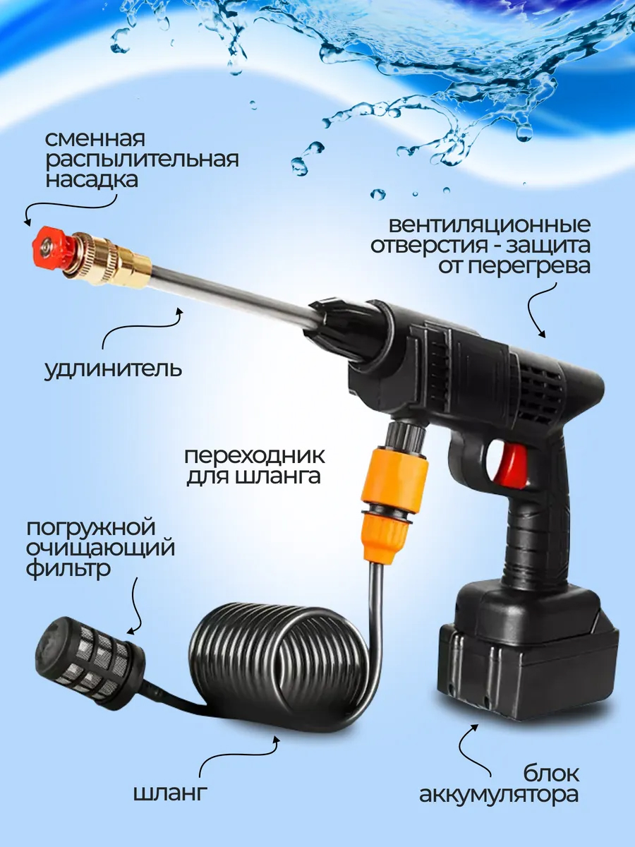 Несмотря на компактный размер, наш пистолет мойка обеспечивает достаточную мощность для эффективного удаления грязи и пыли. Этот набор для мойки автомобиля идеально подходит для различных задач – от мытья автомобиля и мотоцикла до полива растений и чистки террас.